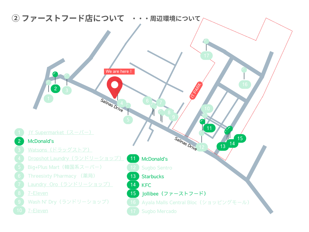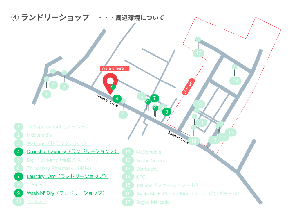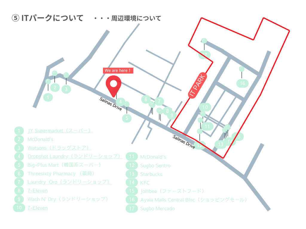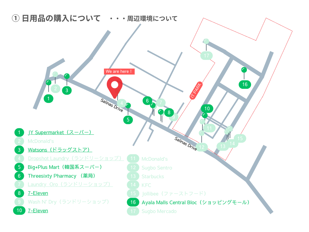 セブ島の中で最も栄えるエリアです。学校を出て左手、徒歩10分ほどに位置します。銀行、ATM、病院、コンビニ、ショッピングモールがあり、お食事はもちろん、日用品、服、家電の購入可。エリア内で生活が完結します。