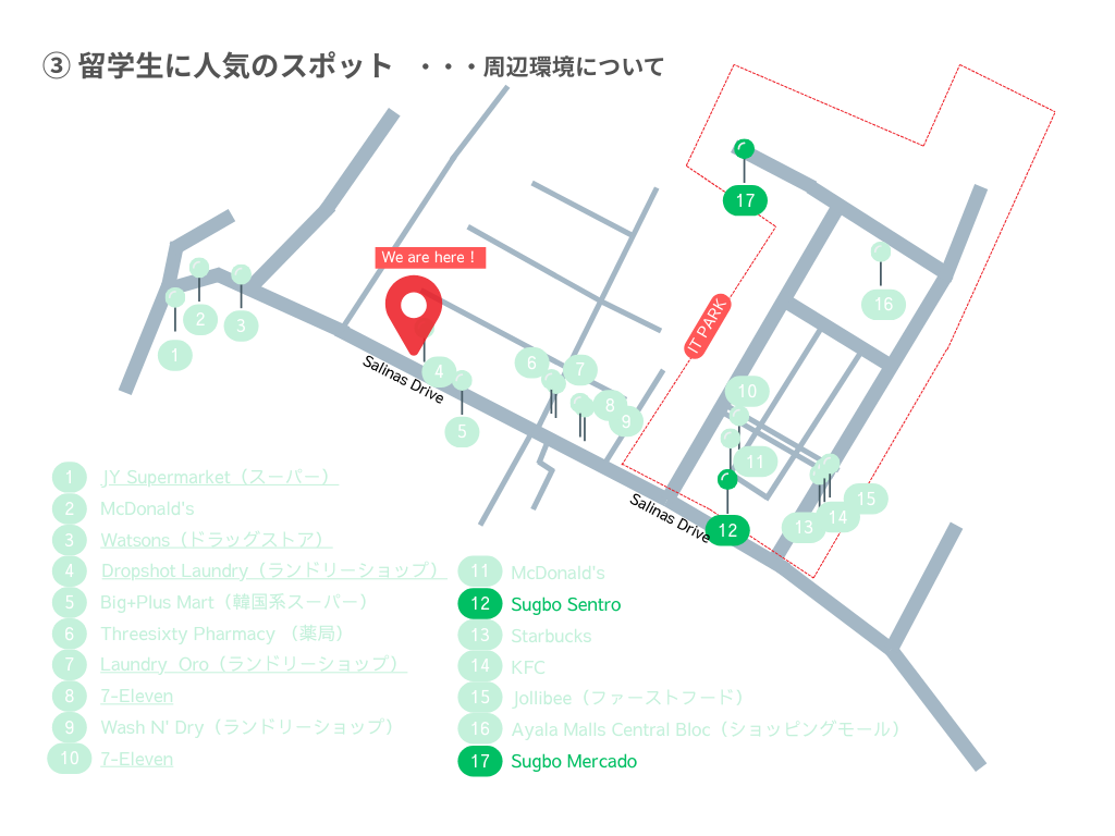 また、セブ島の中心部となるITパークエリアから徒歩10分という好立地にあります。ITパークは、レストラン、カフェ、ショッピングモール、病院、銀行など、生活に必要なすべてがそろった近代的なビジネス街です。フィリピンでは安全性が高く、留学生にとっても安心・快適な生活環境が整っています。